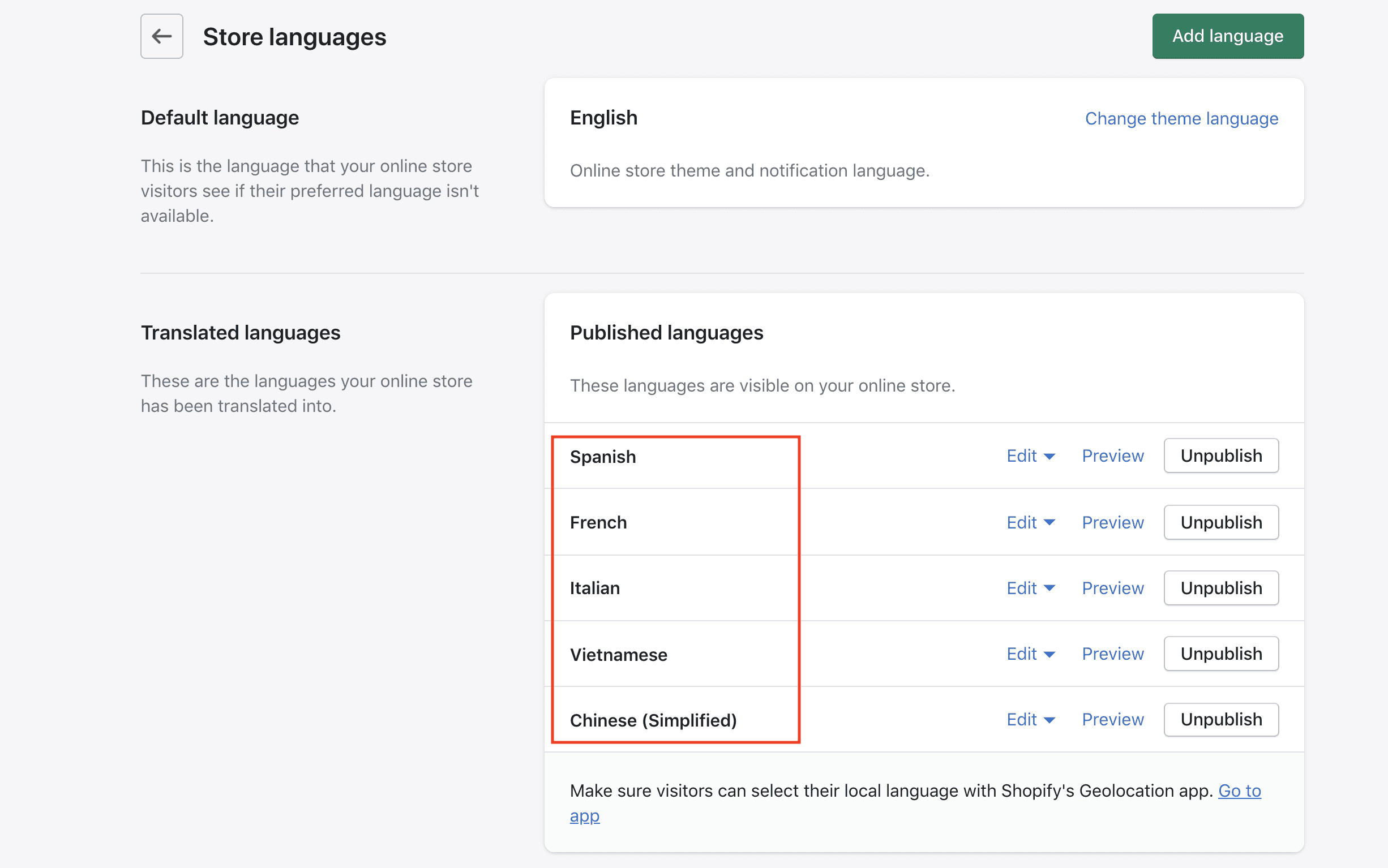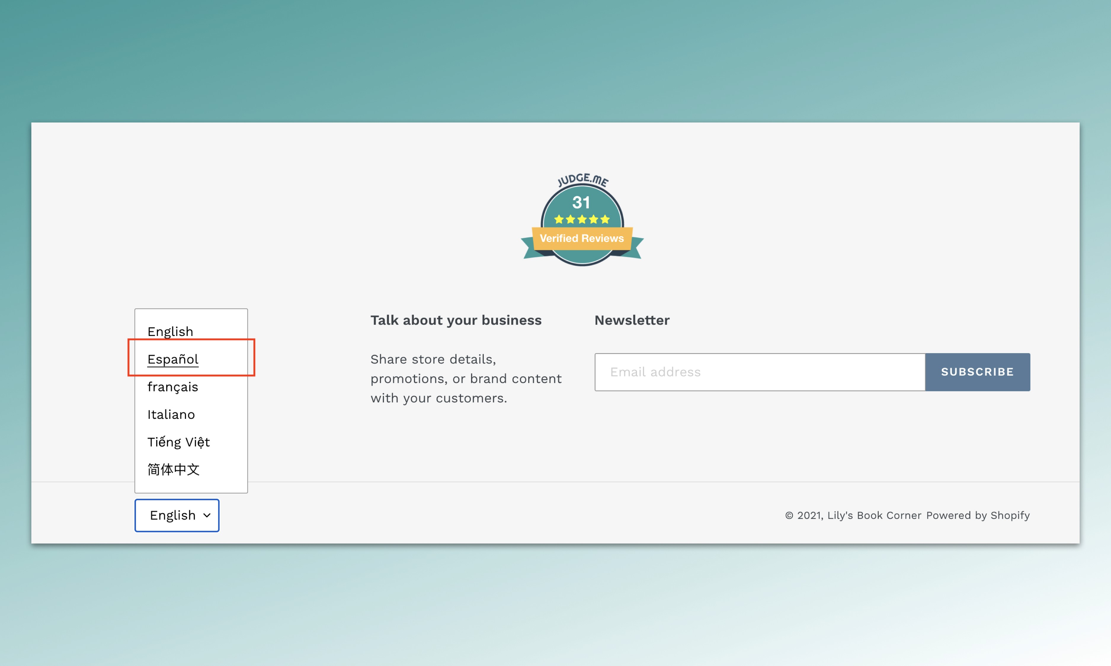 First, please make sure that you have added and published your Translated languages in your Shopify's Store languages settings. This helps us detect the locale of your store and display the correct languages of your Judge.me widgets (from our 35 supported languages). For example, if your store is translated into French, we'll change the widget text into French.