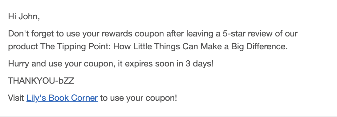 Are you sending coupons as appreciation to your reviewers? Awesome. Rewarding coupons is an excellent way to maintain a relationship with your customers. However, your customers may receive tons of emails daily, so your coupons might be missed.
