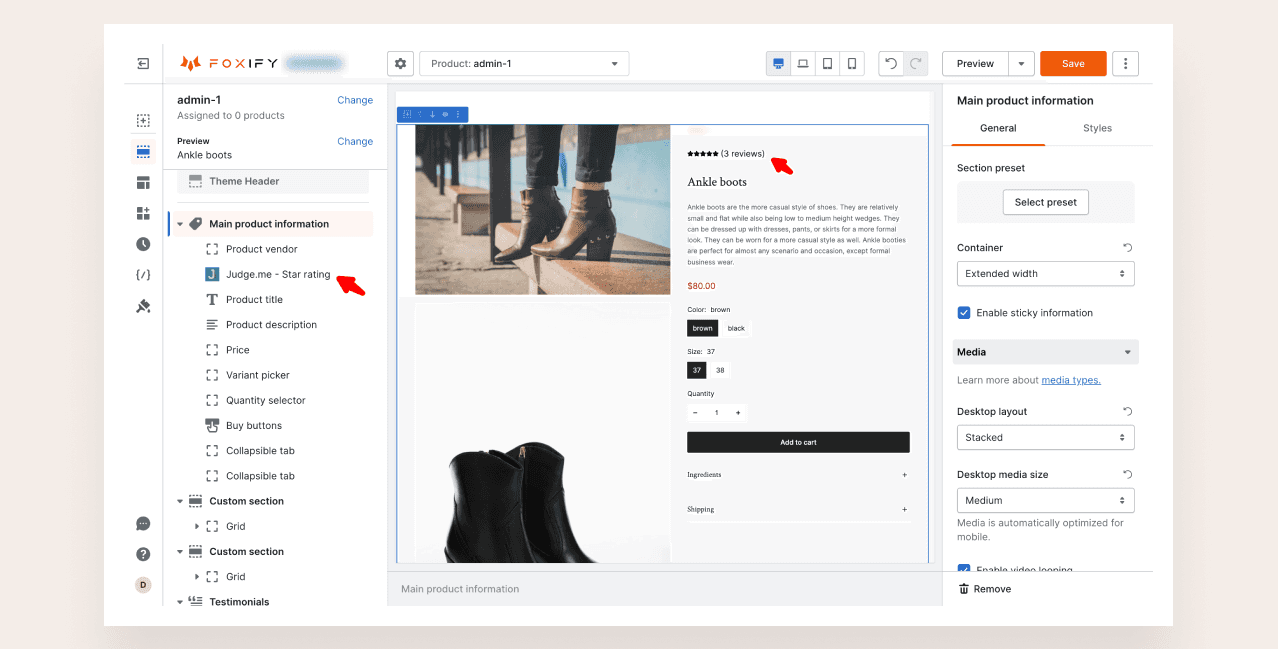 Our integration with Foxify Smart Page builder simplifies the process of incorporating customer reviews into your store. With Foxify app, your creativity knows no bounds when it comes to customizing Judge.me widgets to perfectly match your brand's unique style.