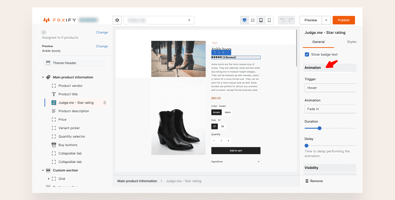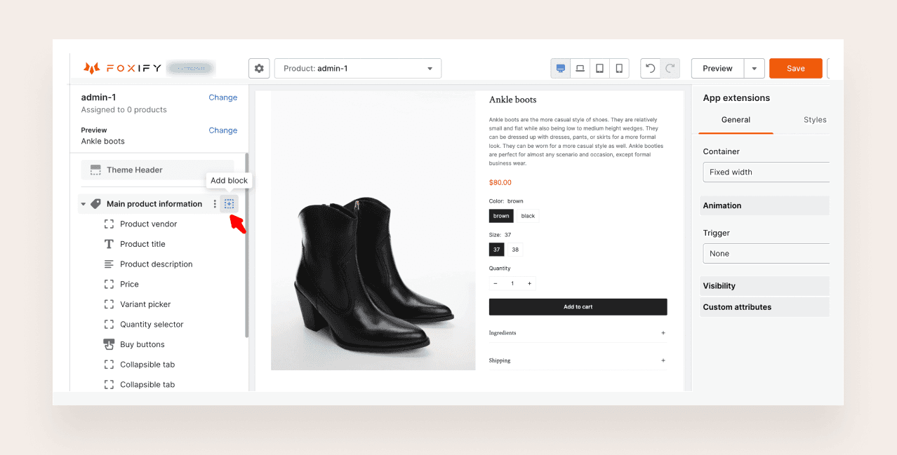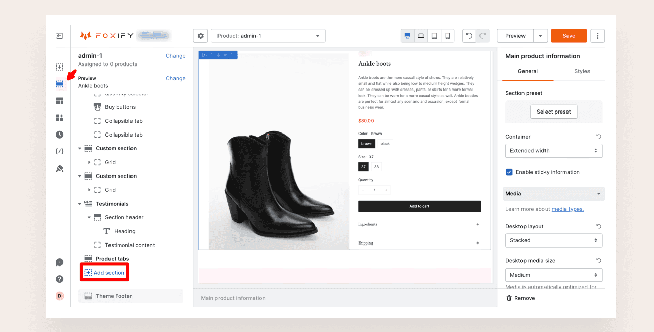 Looking to make your text more engaging? Easily tweak the typography from the Styles tab on the right. Foxify app even allows you to upload your own fonts beyond the limited Google fonts, setting your store apart from the rest.