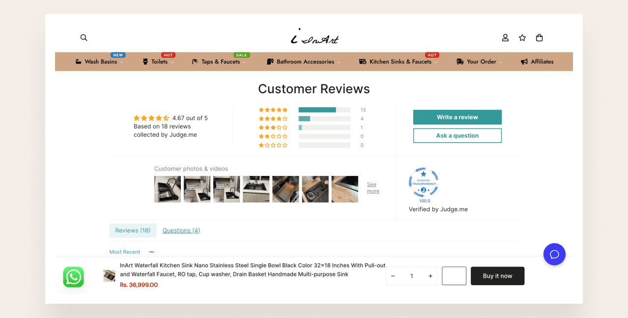 There's much to learn from InArt's approach to displaying product reviews using Judge.me. Instead of only allowing text reviews, customers can upload videos or photos featuring real-life products. This gives new buyers a clearer understanding of each product before purchasing.