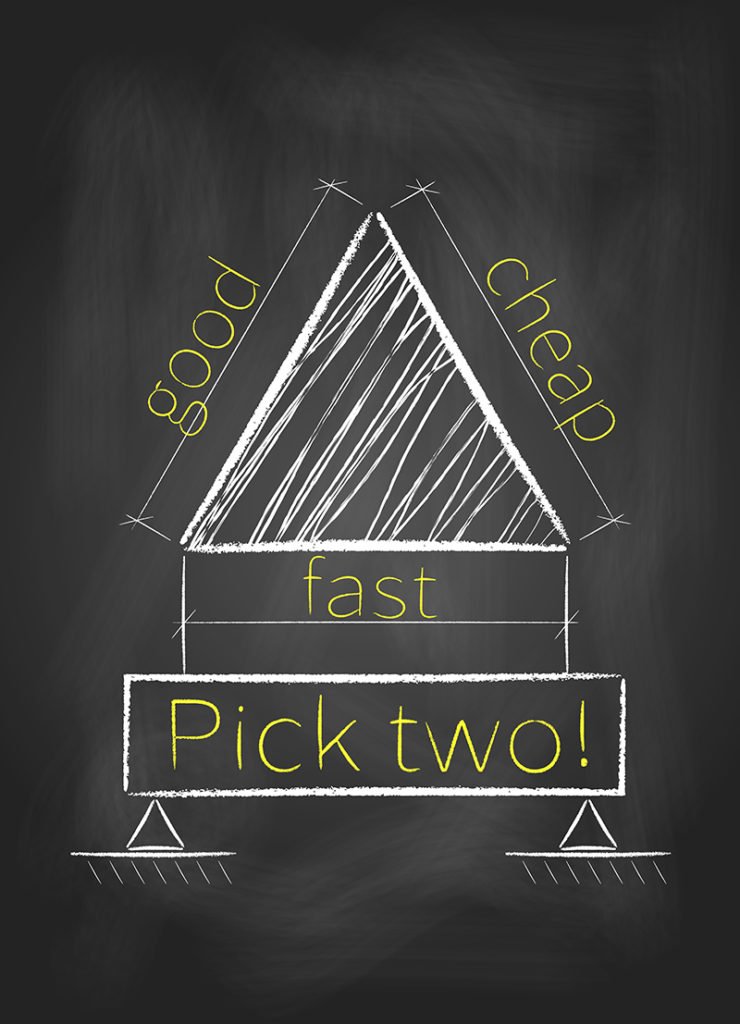 For example, you could have a very high-quality good that's delivered relatively quickly, but at an incredibly high price for manufacturing and fulfillment (which means higher prices for customers). Alternatively, you can have a very low-quality good that's delivered reasonably quickly, but that's cheap to manufacture and fulfill (meaning lower prices). And of course, there are many combinations beyond that.