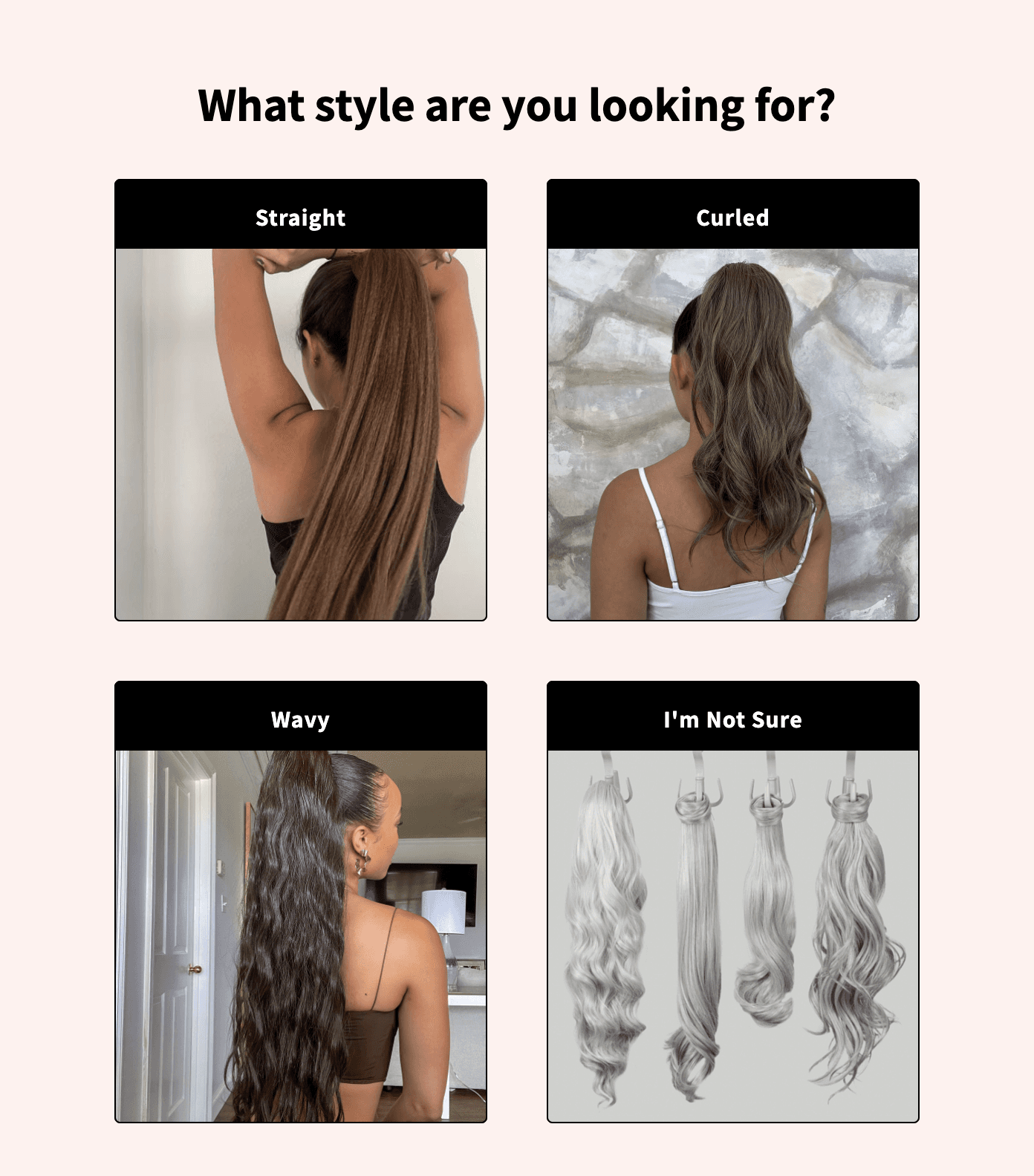 Interactive quizzes help offer personalized services to your site visitors by asking them a series of questions to help them identify the best products. For example, INH Hair uses interactive quizzes to determine user preferences. The store sells a range of hair products such as wigs, hair extensions, styling tools, etc. When customers come to their site, they get to engage in the quiz below: