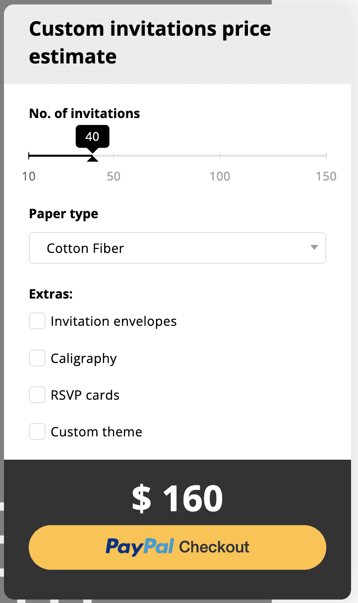 The custom calculator from Calconic below is an example of how interactive this tool can be. It lets consumers determine the price for their invitation cards. Customers get to choose the type of paper they want for their invitation cards and the extras they need. An interactive calculator eliminates the need for unnecessary consultations about price, quantity, or other product details.
