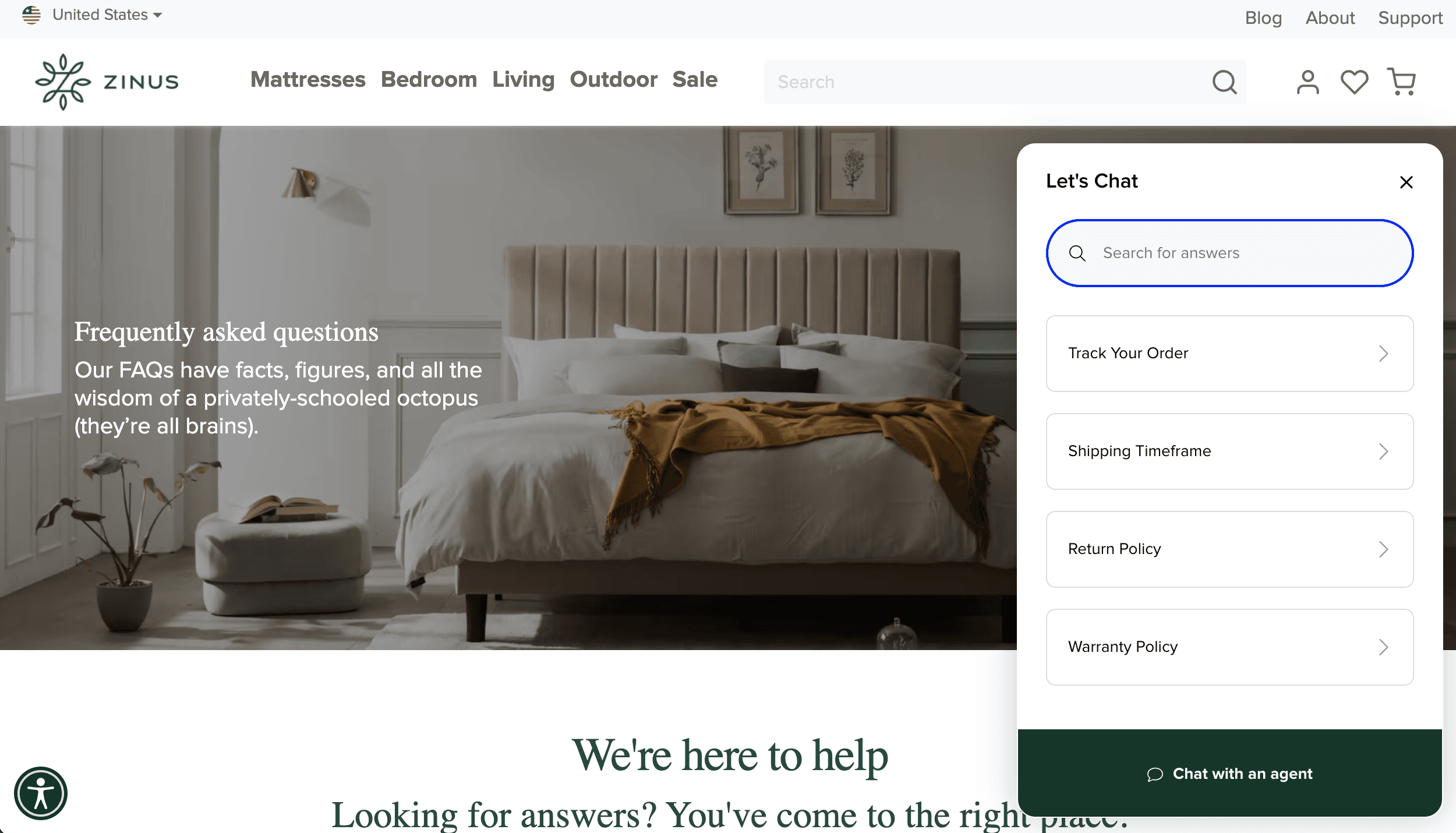 For example, the chatbot on the Zinus website allows you to search through the website’s content. It also presents different options that users are most likely to search for. Offering answers in real-time helps Zinus provide a satisfactory experience to its customers.