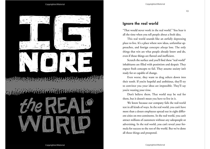 In either case, the initial goodie you send to the user, be it an ebook, whitepaper, video, or report, should be immensely valuable. The document should be well designed. A reference I like to use is the book Rework by Jason Fried and David Heinemeier Hansson, the co-founders of 37signals. In their iteration, the document is comprised of side-by-side pages, one with a beautiful quote poster that represents the point of the section and the other with the actual written-out text.