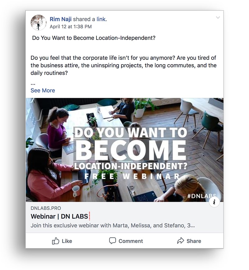 When posting to Facebook Groups, address the group contextually. When posting to your personal account, tell people why you made this content and what it means to you. Avoid copy/paste marketing speak at all costs. If it sounds like marketing on Facebook, people will perceive it that way.