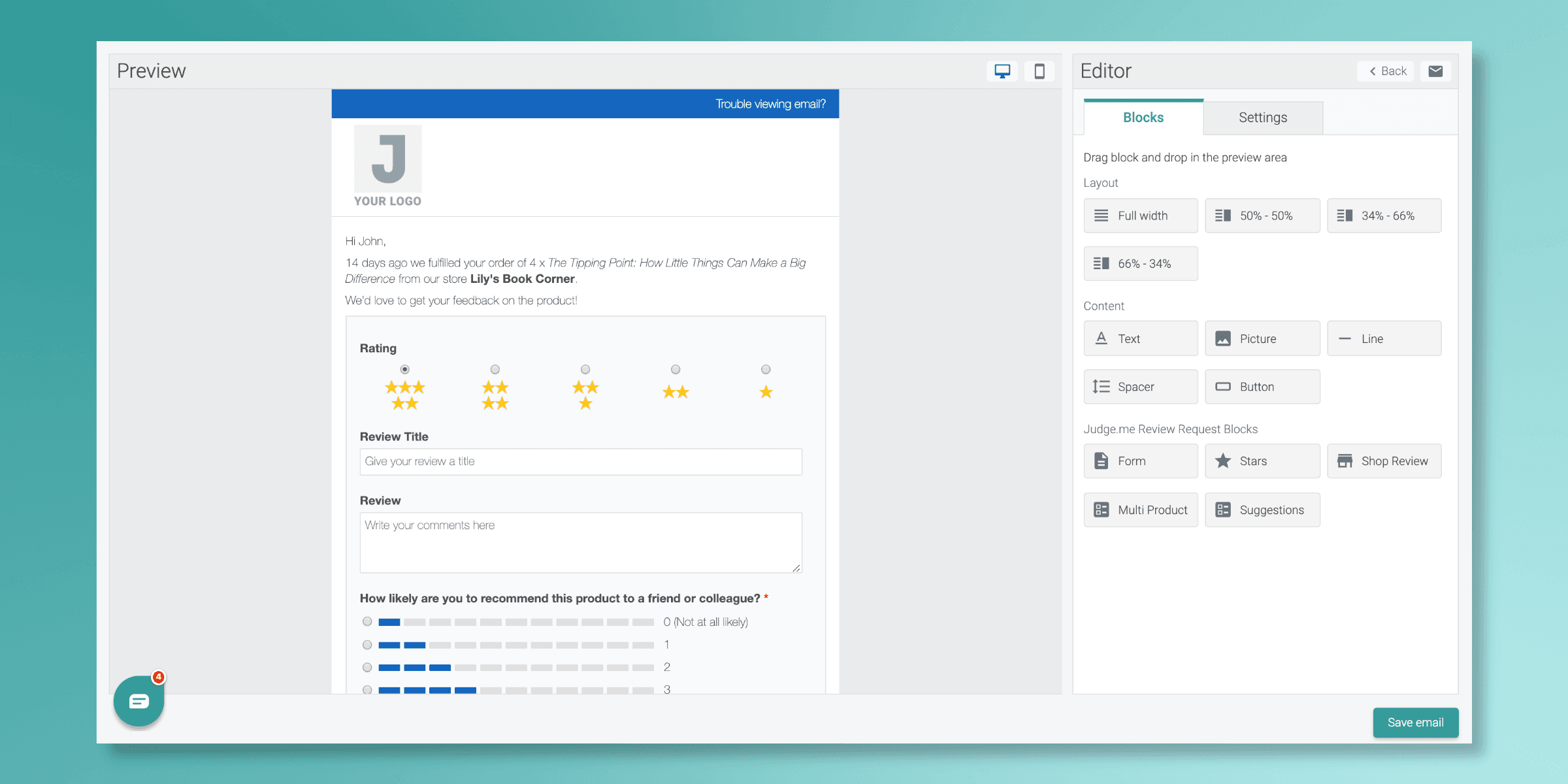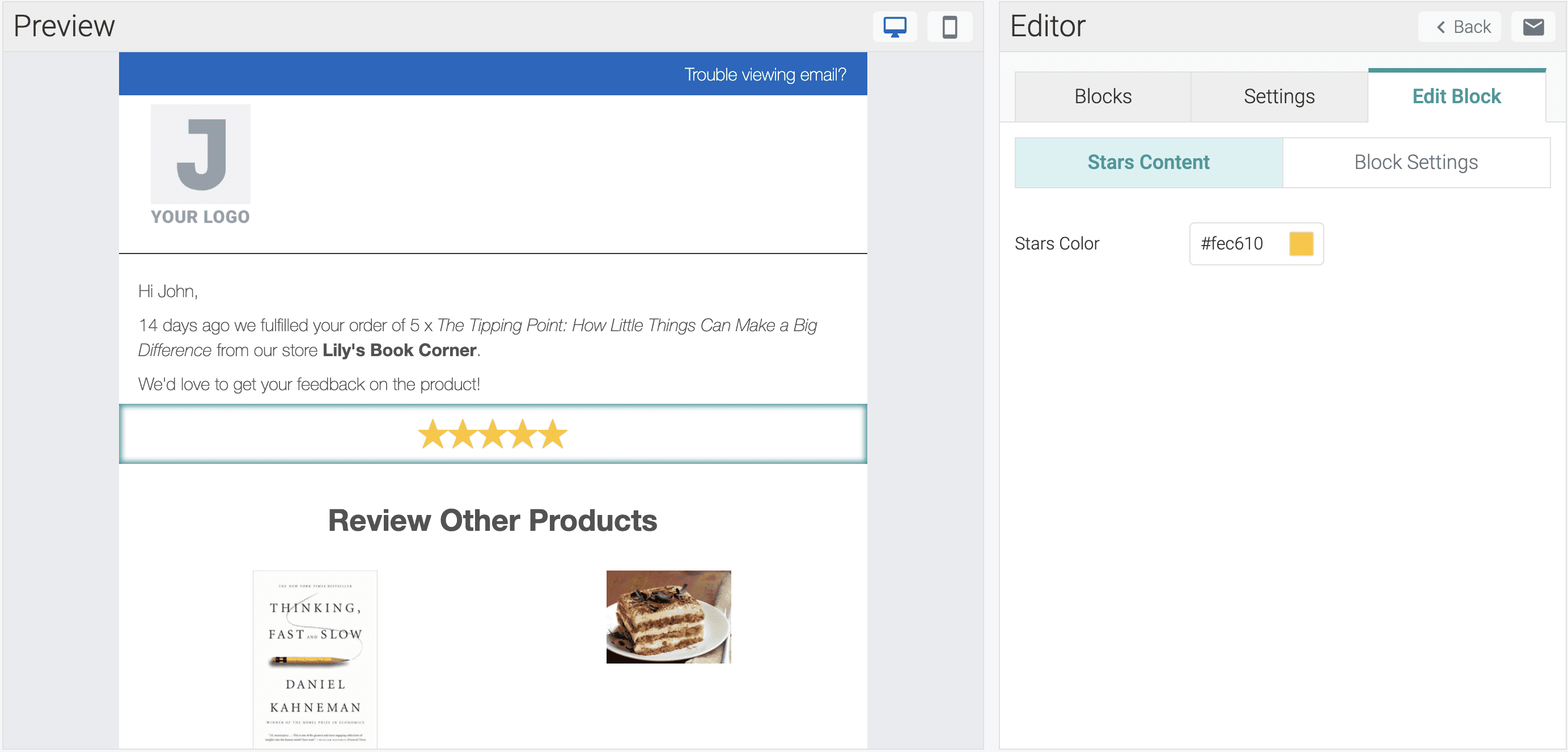 This block provides you with an in-email form for customers to review your products directly inside the email they receive from you.