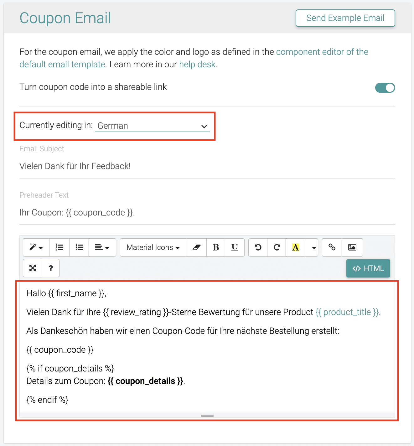 In Coupon Email settings, choose the language you want to edit from the drop-down menu