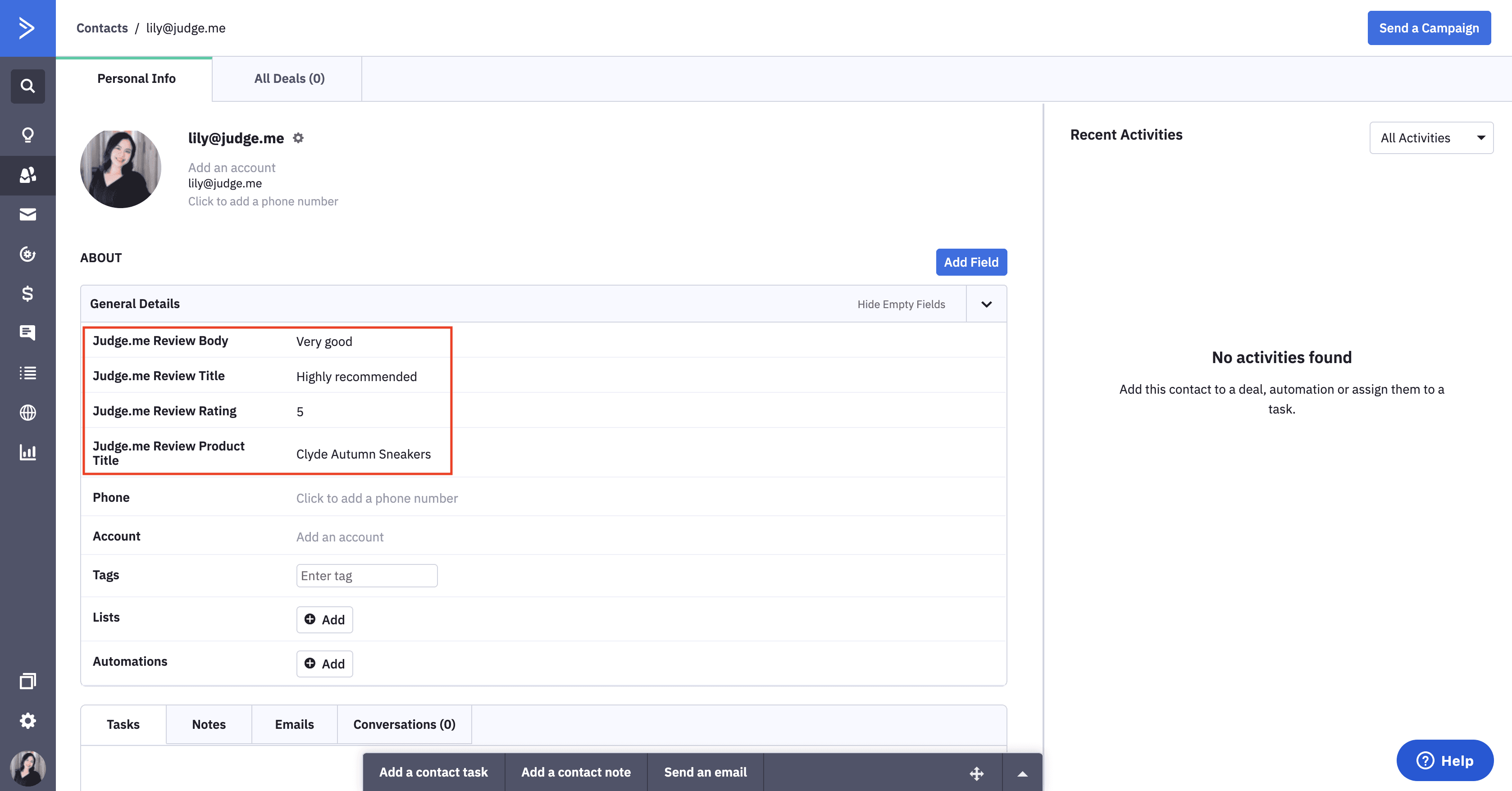With ActiveCampaign <> Judge.me integration, whenever your customers submit a review on Judge.me, you'll receive the following data as custom fields in your ActiveCampaign dashboard: