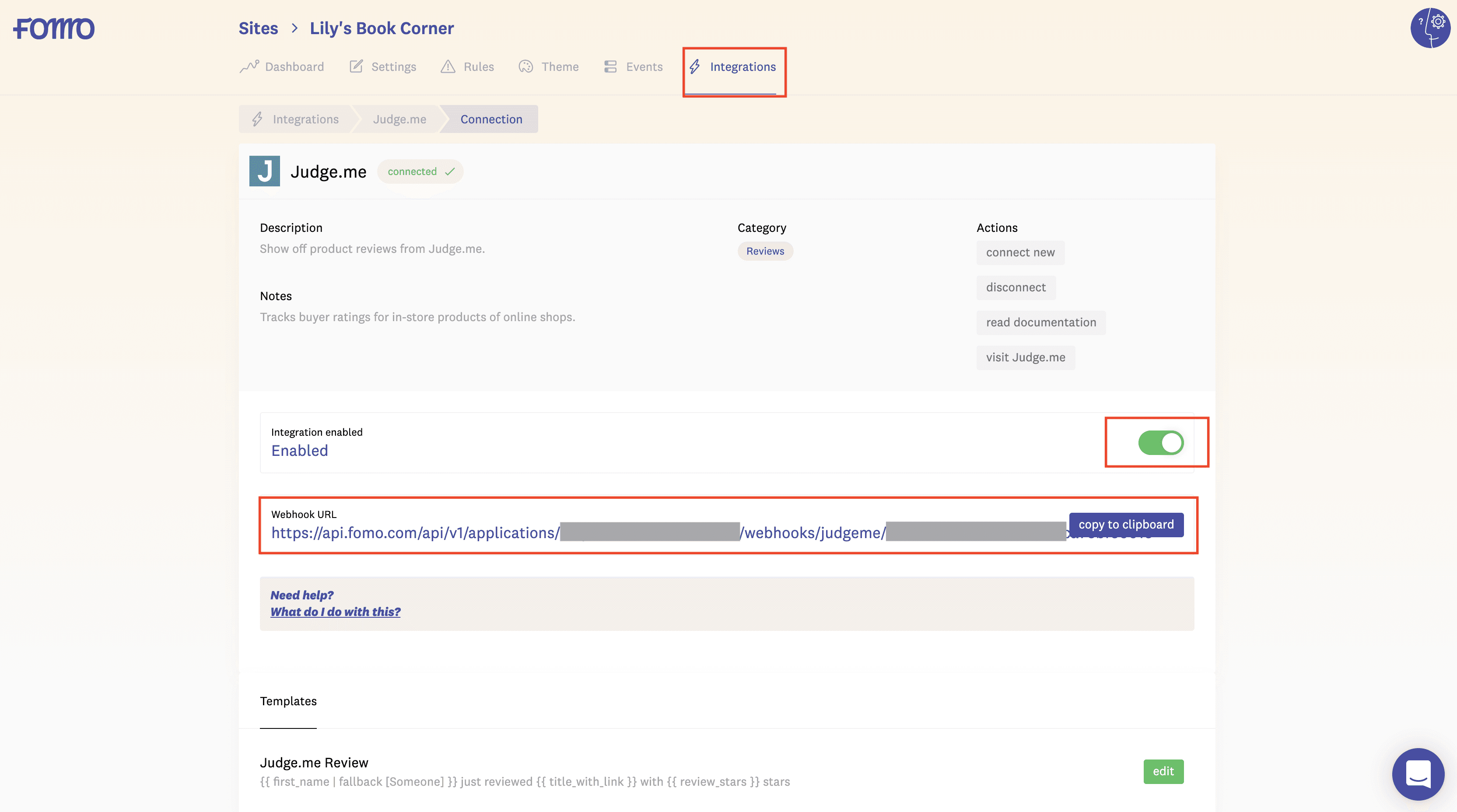 After installing Judge.me and Fomo, follow this instruction to enable the integration by adding Fomo Webhook URL to your Judge.me app.