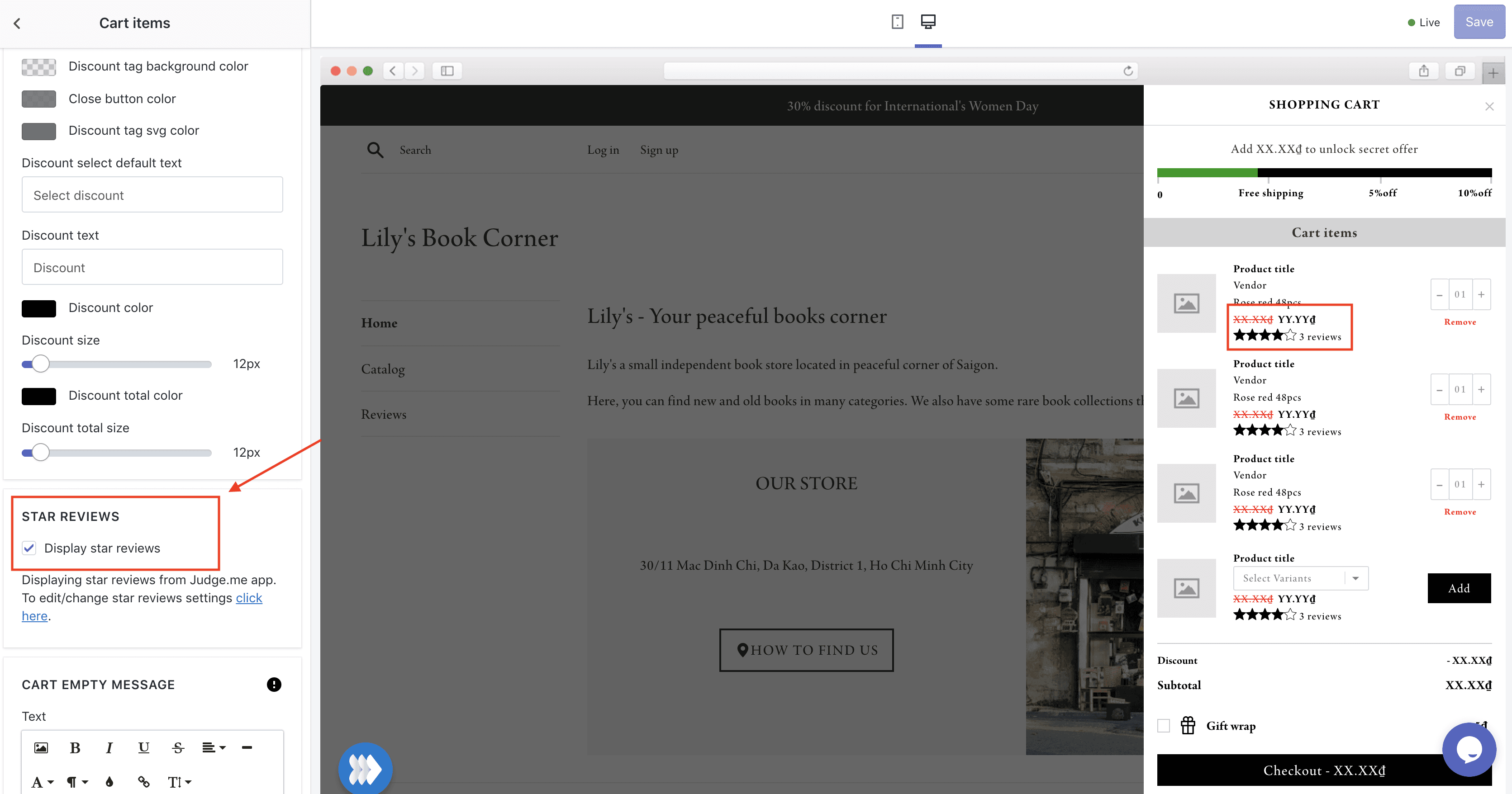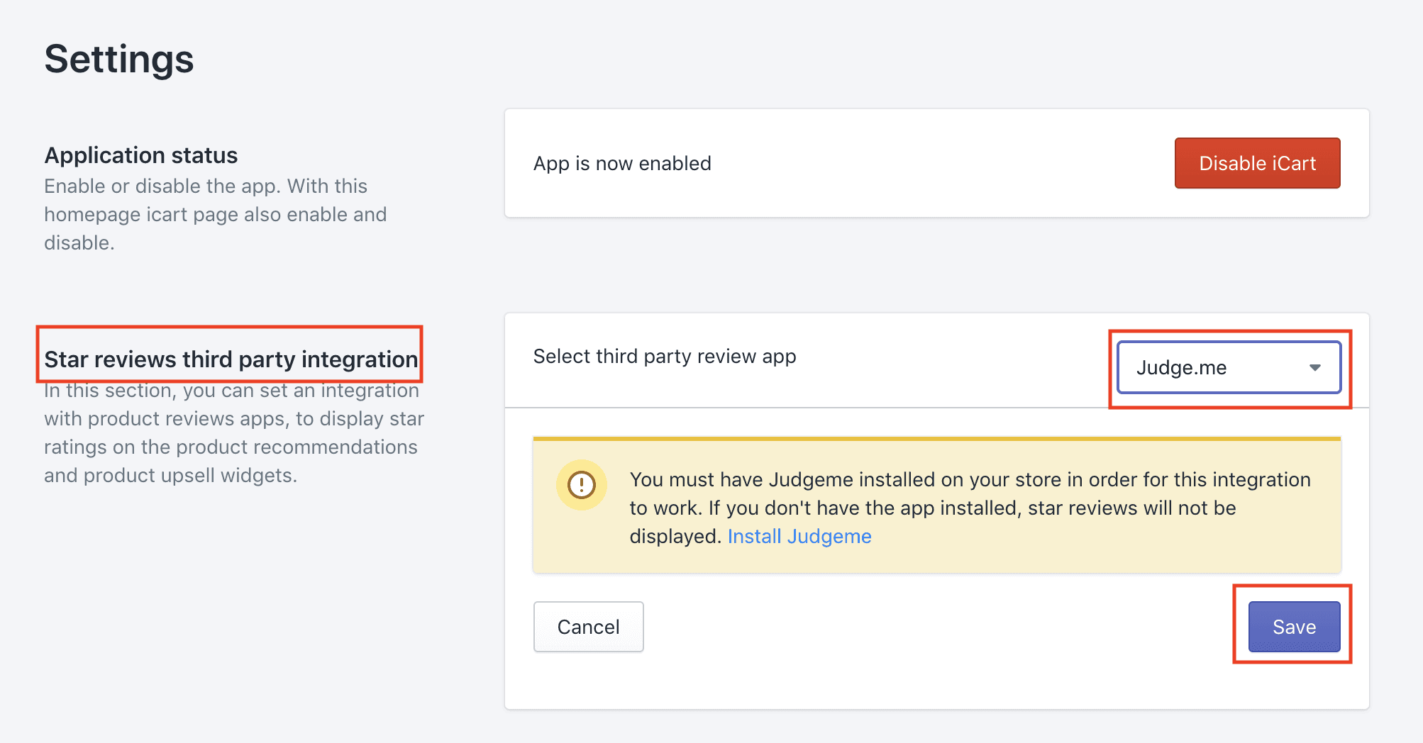After installing Judge.me and iCart, follow these instructions to enable the integration. It's simple - just choose Judge.me as third-party review integration, then enable the Star reviews as you customize your iCart widgets.