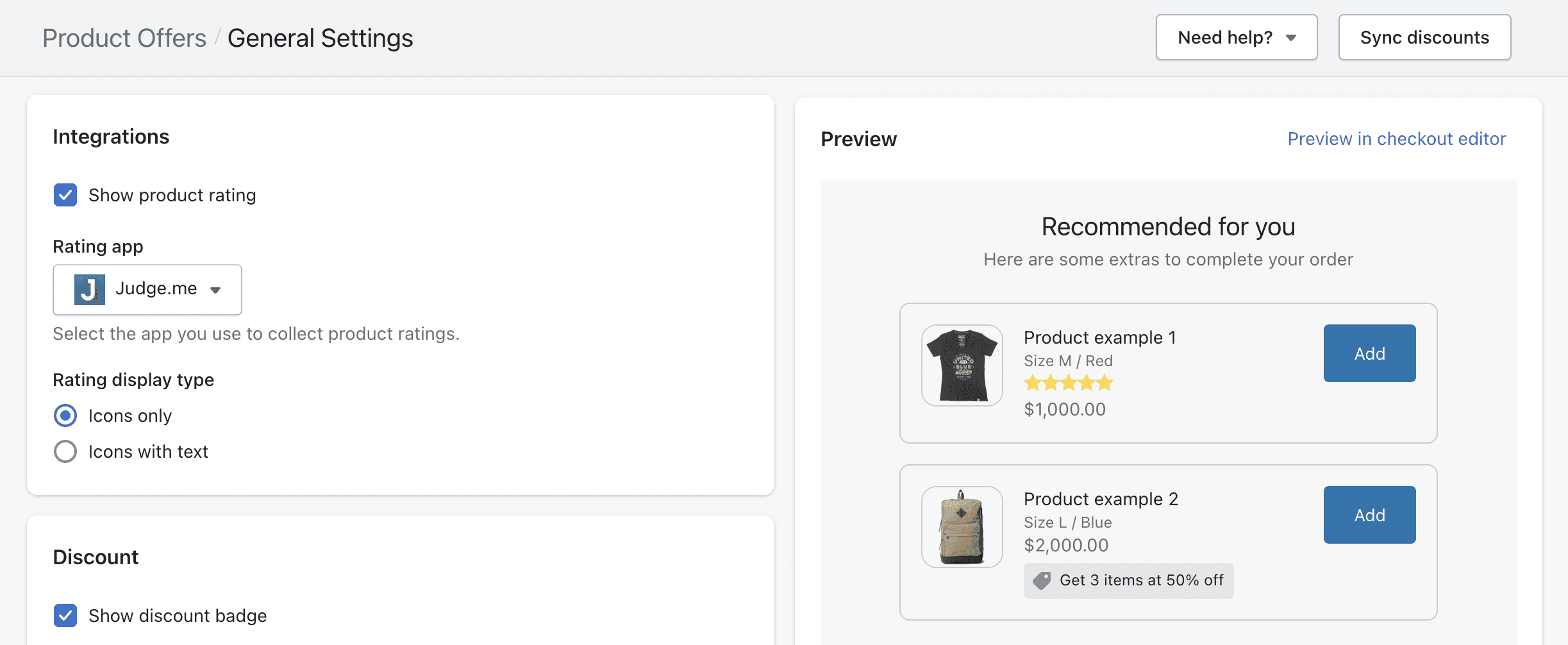 Enabling this integration is easy, you only need to go to the General Settings of your product offers, then check on the "Show product rating" box and choose Judge.me. Then Judge.me reviews will be displayed together with the product offers when your customers arrive at the checkout.