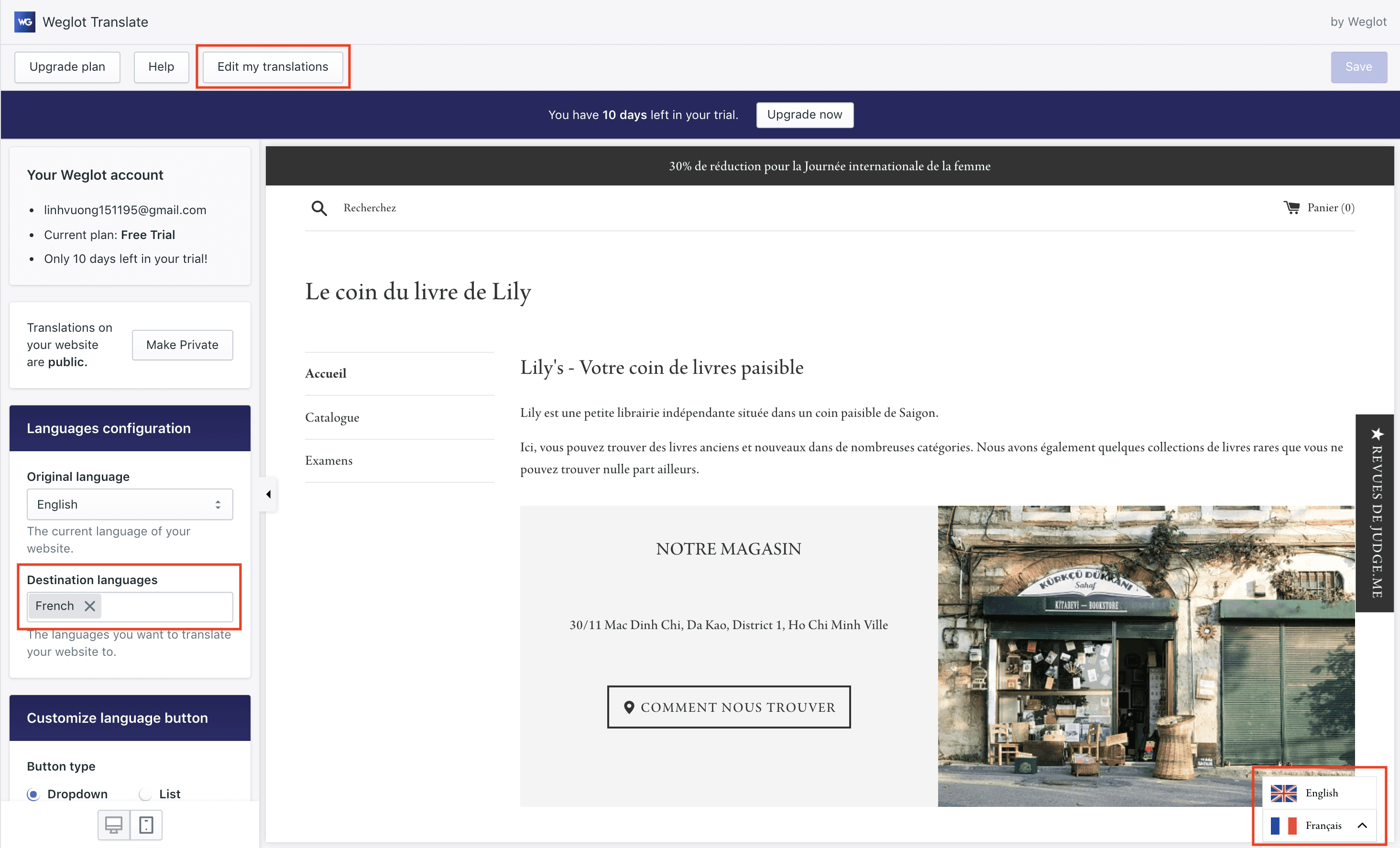 To enable this integration, install both apps and add your destination languages in Weglot settings. Then you are all set! Your Judge.me's widgets and reviews will be translated automatically by Weglot.