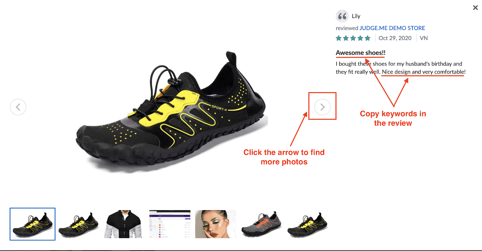 Once you have scrolled through the photos and found your best reviews, you can copy some keywords from your selected review such as “awesome shoes!” or “nice design and very comfortable”.