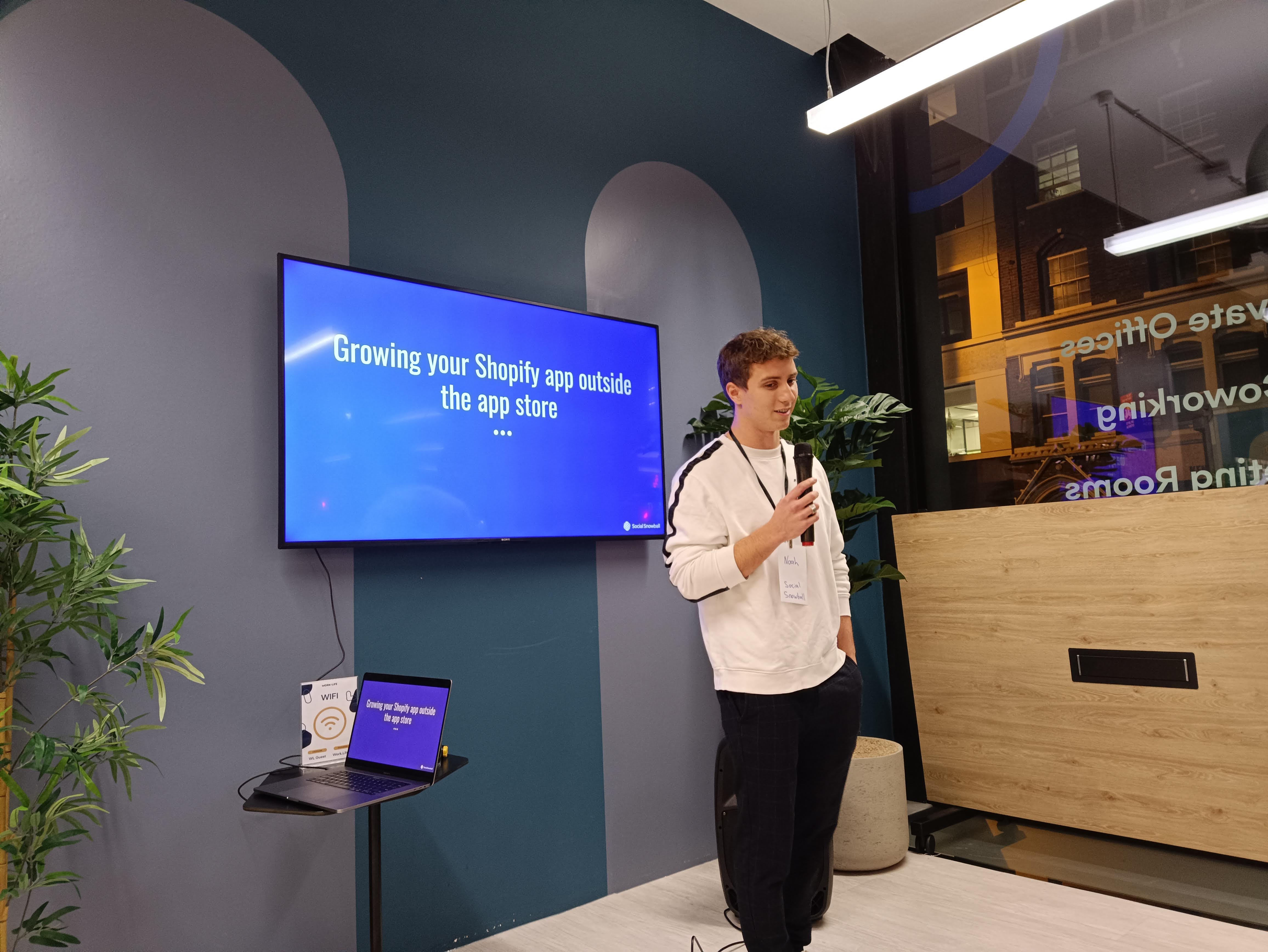 On a chilly winter’s evening on Tuesday, February 21, we co-hosted our second Shopify Tech Partners Meetup at our Old Street offices in the heart of London’s tech scene. Building on the success of January’s event, when Jack of TranslateCI shared his wisdom about growing online stores in underserved markets, we had Noah Tucker from Social Snowball down to Judge.me HQ to tell us a little about app marketing—and how smaller, bootstrapped businesses in particular can master it.