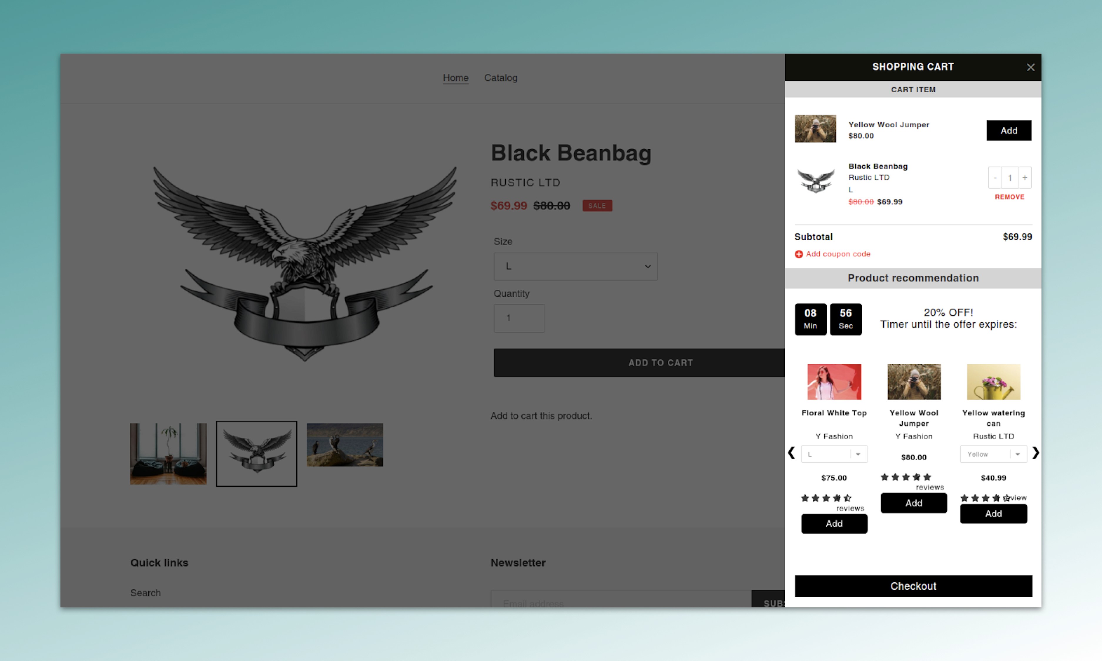 To show upsells on your store, you can do it manually or use any Shopify apps like iCart Cart Drawer Cart Upsell. iCart offers amazing upselling and cross-selling options to optimize your shopping cart (both cart drawer and full cart page). Learn more about how to upsell with the iCart Shopify app.