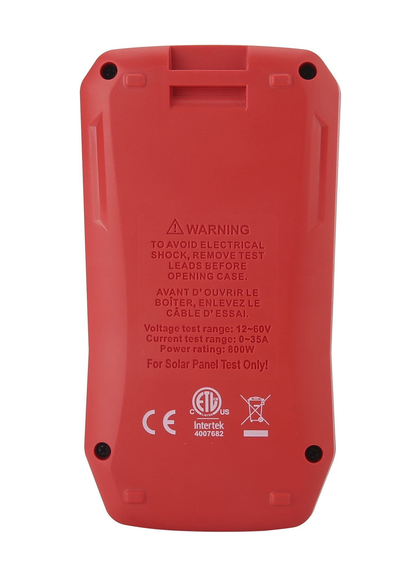 • Comprehensive Testing Capabilities: Measures peak power current (0-35A), peak power voltage (12-60V), open circuit voltage (12-60V), and short circuit current (0-35A)