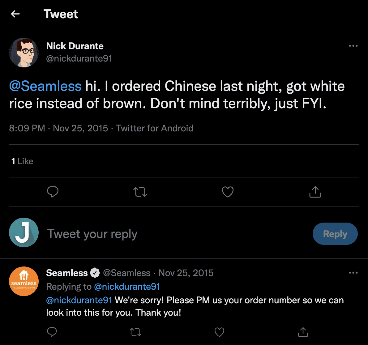 Brands monitoring comments can use them to improve their customer service. Like, when a customer tweeted Seamless food delivery company to point out a mistake in the order, the brand responded by asking for details to be able to take action: