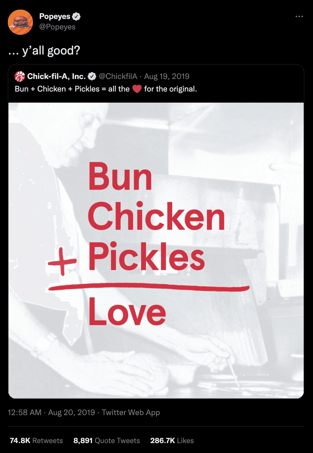 The post generated even more engagement when Popeyes retweeted Chick-fil-A's post and answered with the phrase "... y'all good?"