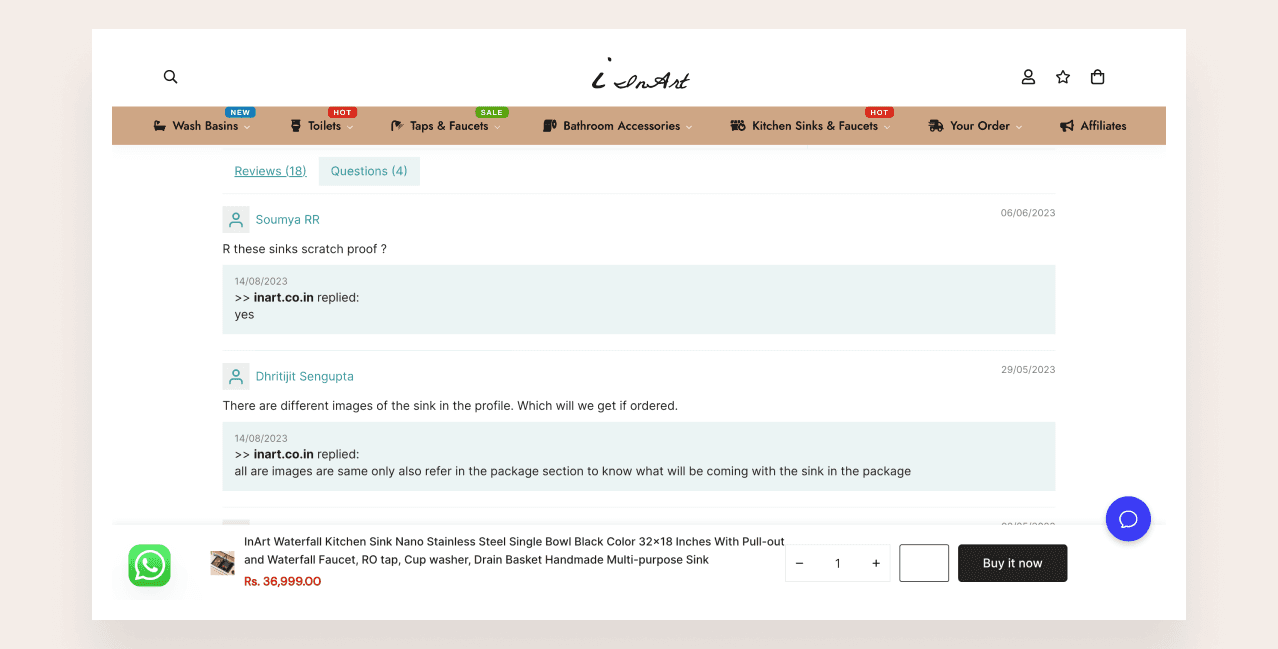 InArt also uses the Questions and Answers widget, enabling customers to inquire about products directly and receive prompt responses. This not only showcases their high-quality customer service but also attracts new buyers, as 70% of customers decide to purchase from a brand based on its service quality.