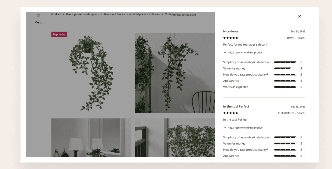 A handy side menu pops up when you click on the reviews section on an Ikea product page. Here, you can easily see overall customer ratings for various aspects of the product. Each item is rated based on different factors, and a scale shows how well it performs in each category.