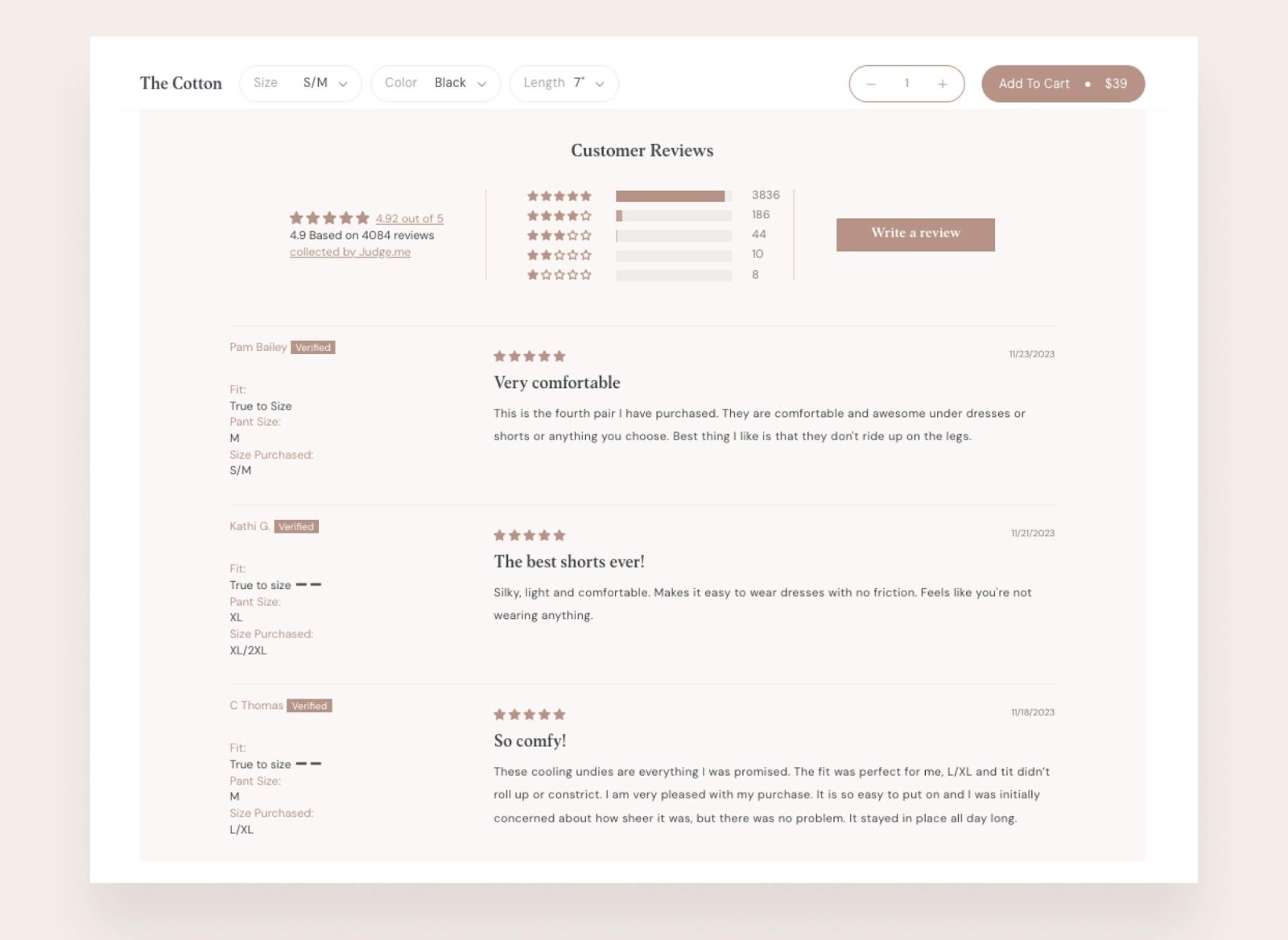 Leveraging Judge.me’s custom questions, Thigh Society’s reviews come with 3 aspects - fit, pant size, and size purchased; ensuring you can buy that perfectly match your body type. Reviewers rate the fit, ranging from ‘runs small’, 'true to size', to 'runs big', providing valuable insights to potential buyers in making the right choice.