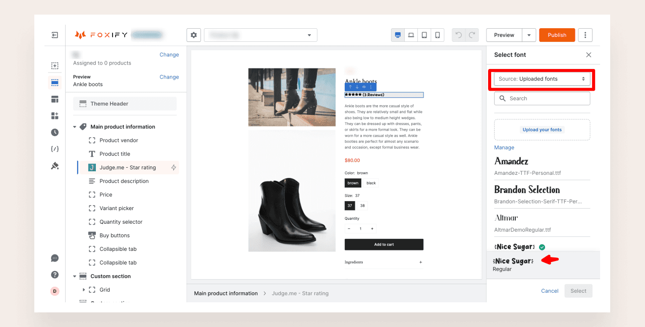 Looking to make your text more engaging? Easily tweak the typography from the Styles tab on the right. Foxify app even allows you to upload your own fonts beyond the limited Google fonts, setting your store apart from the rest.