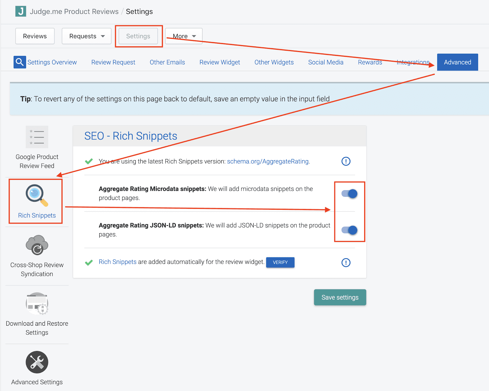 However, the easiest alternative would be to use an app that does all the work for you. With Judge.me, all you have to do is install the app and turn on the review snippets option in settings. The rich snippets will then be added to your pages without you having to work for it!