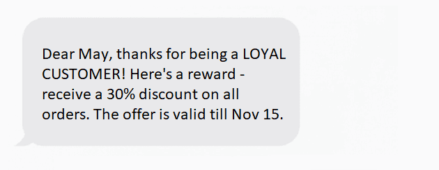 When sending SMS to customers, you don't do that just to remind them about yourself but to provide some value, right? Your messages should be relevant and useful, providing the information your customer needs: special member-only sales, discounts, new product launches, delivery timing, appointment reminders, etc.