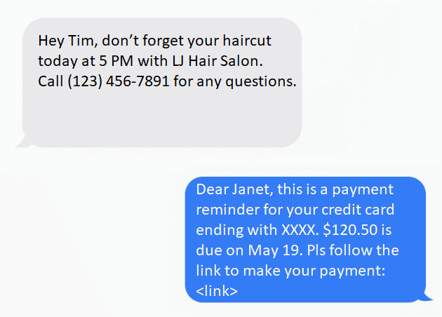 Keep your SMS concise yet informative: 160 characters is a maximum length in most cases, depending on the platform you use and the phone your customers have. Long messages might fail to arrive or get broken into several parts, which hurts usability and is not user-friendly.