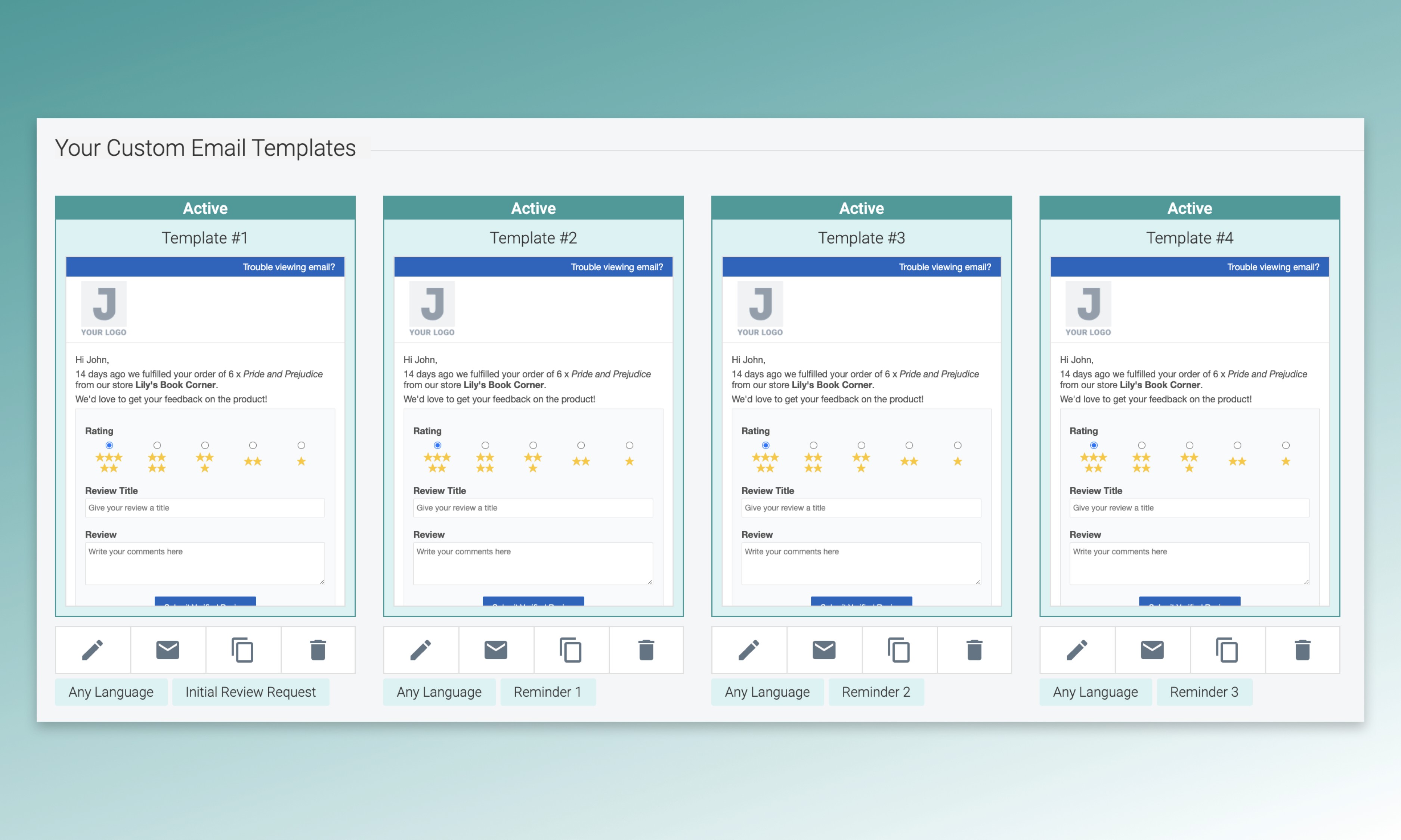 Our automatic reminders feature lets you send up to three reminders after your initial review request emails. After enabling the automatic reminders, you can create many email templates and assign them as Initial Review Request or Reminders in the email settings. You need to activate all template to make the sequence work. In case you accidentally deactivate any template, we’ll apply specific rules to pick the desired template when sending each of your request emails.