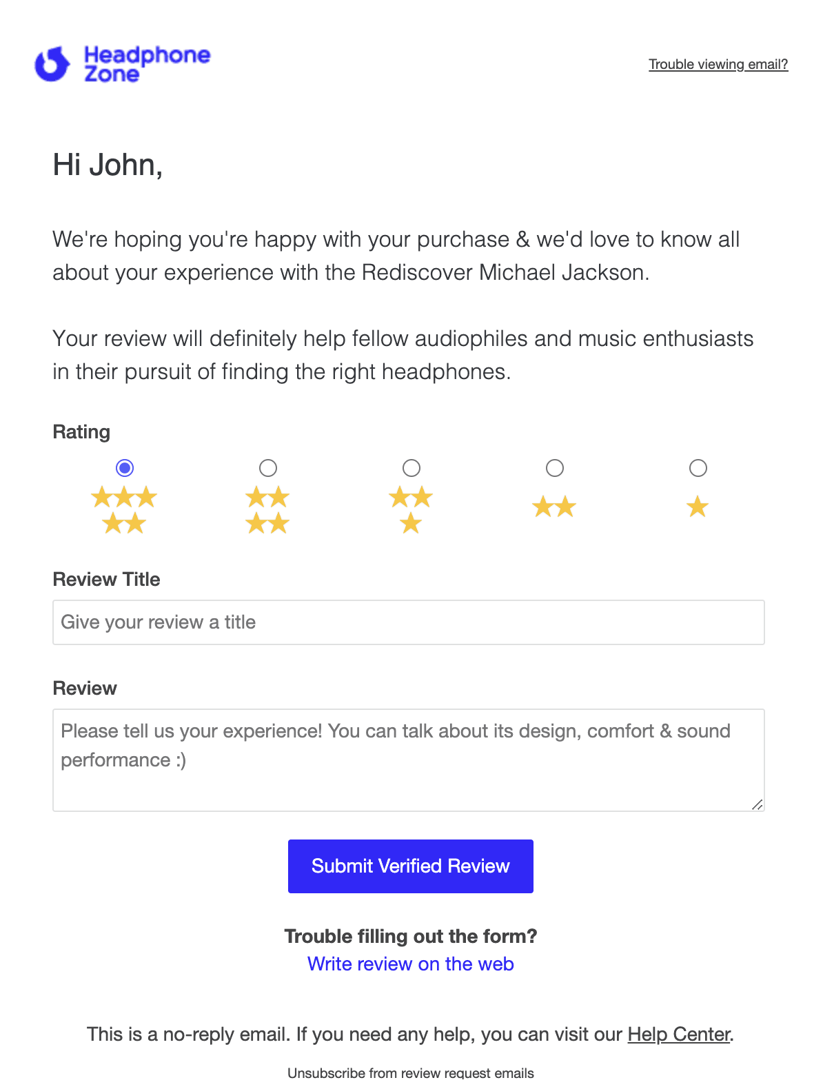 Another great tactic from Headphone Zone is the use of the Review Request Emails. We all know that the best way to get reviews is simply by asking for them, so this is what Headphone Zone does. Your customers have received the product and may have a great experience with it, but they may forget to give you a review. Why not ask them via a review request email, then?