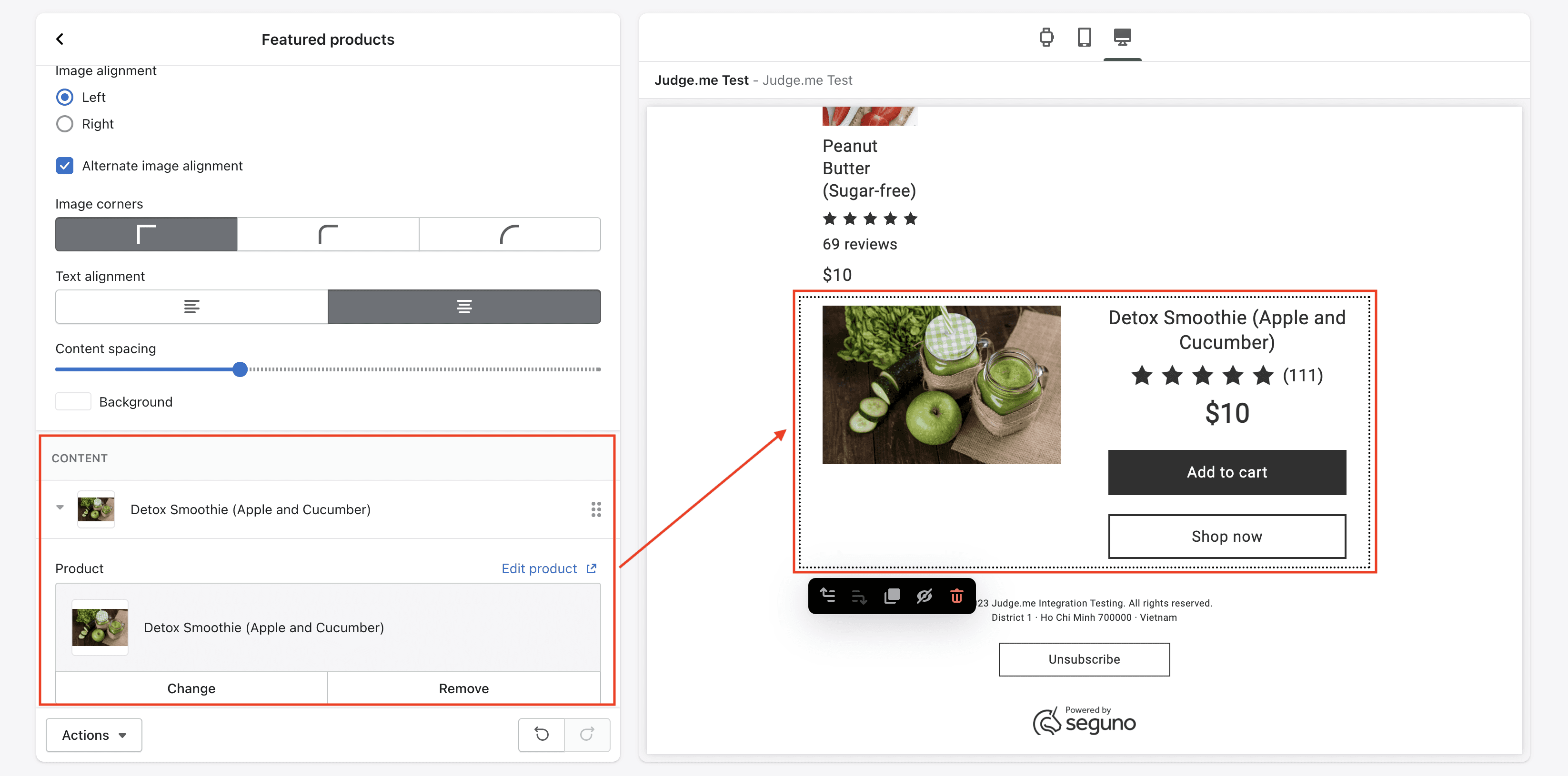 With Seguno integration, you can show Judge.me product ratings in the Featured Products, Featured Collection, and Product List sections in your newsletters or automated email campaigns in Seguno.