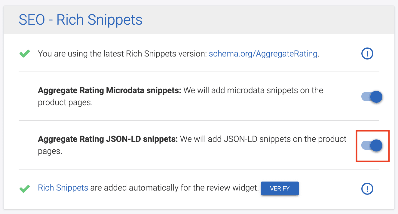 To use this integration, make sure that you have installed both Judge.me and SEO Booster, and your JSON-LD snippets are enabled in Judge.me Settings > Advanced > Rich Snippets: