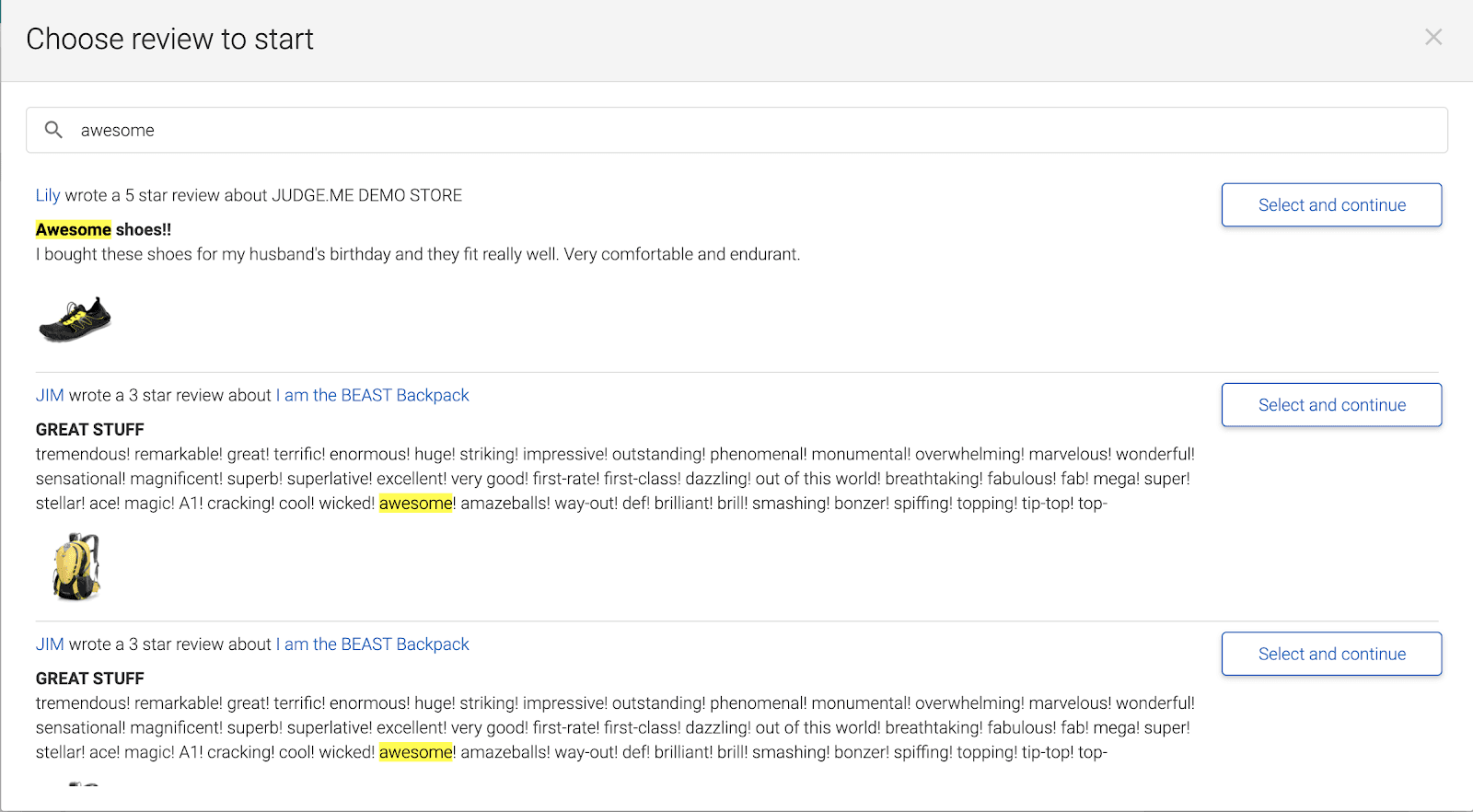 In the search box, paste the keywords you just copied from the reviews, press Enter/Return and you’ll see a list of reviews including these keywords. Choose the reviews you want, click Select and Continue, then finish other steps to create your beautiful review cards.