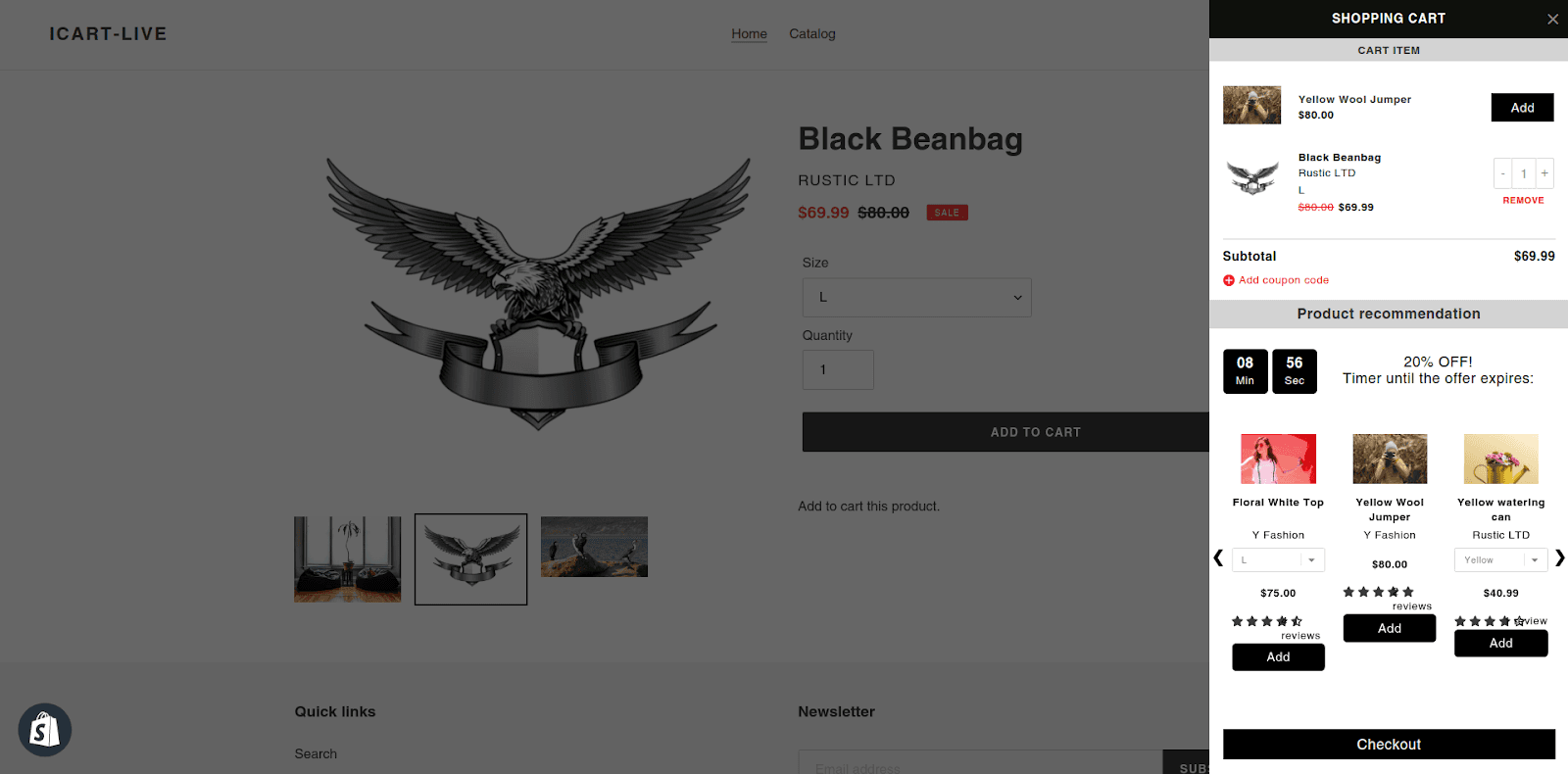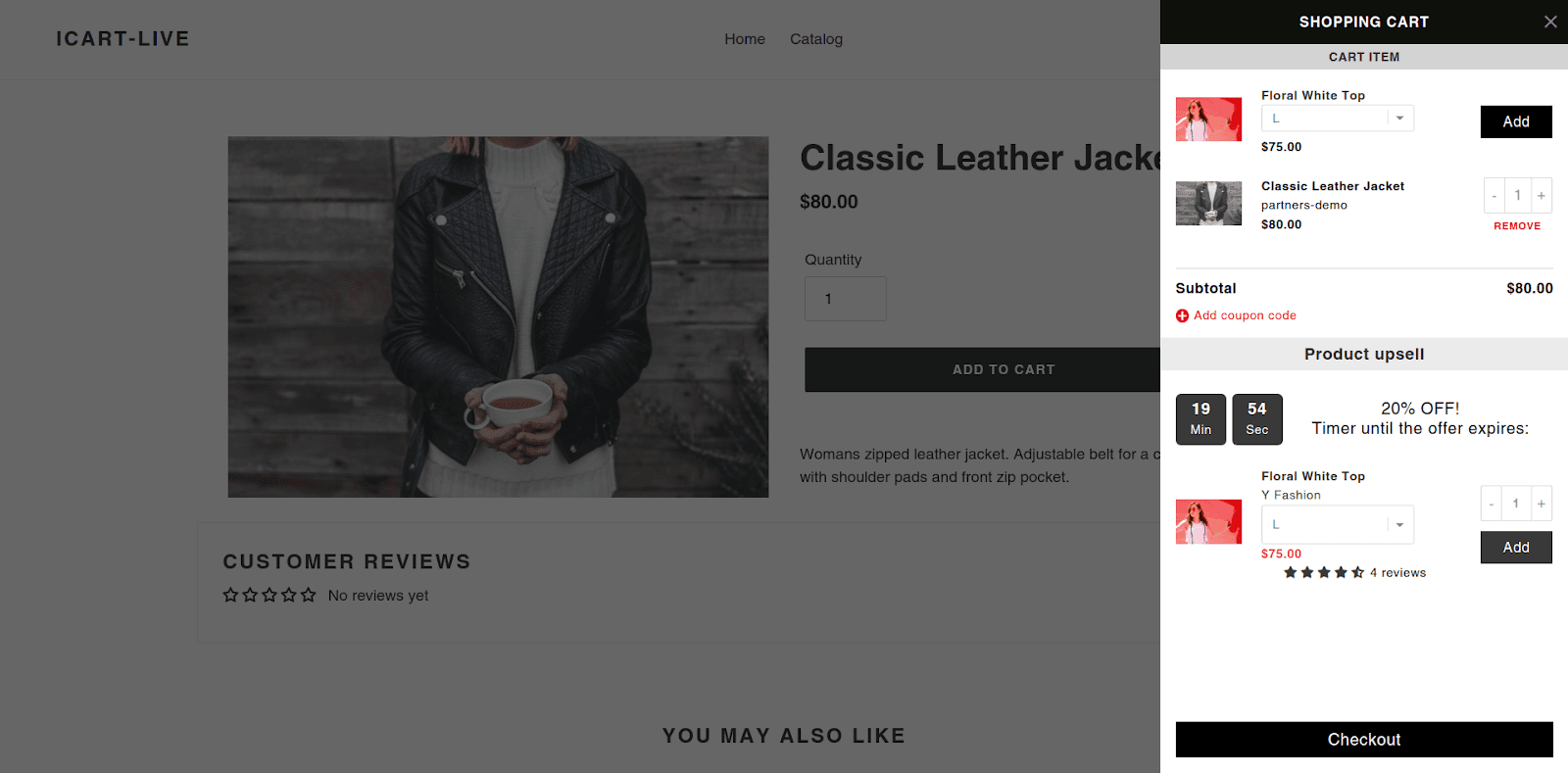 To show upsells on your store, you can do it manually or use any Shopify apps like iCart Cart Drawer Cart Upsell. iCart offers amazing upselling and cross-selling options to optimize your shopping cart (both cart drawer and full cart page). Learn more about how to upsell with the iCart Shopify app.