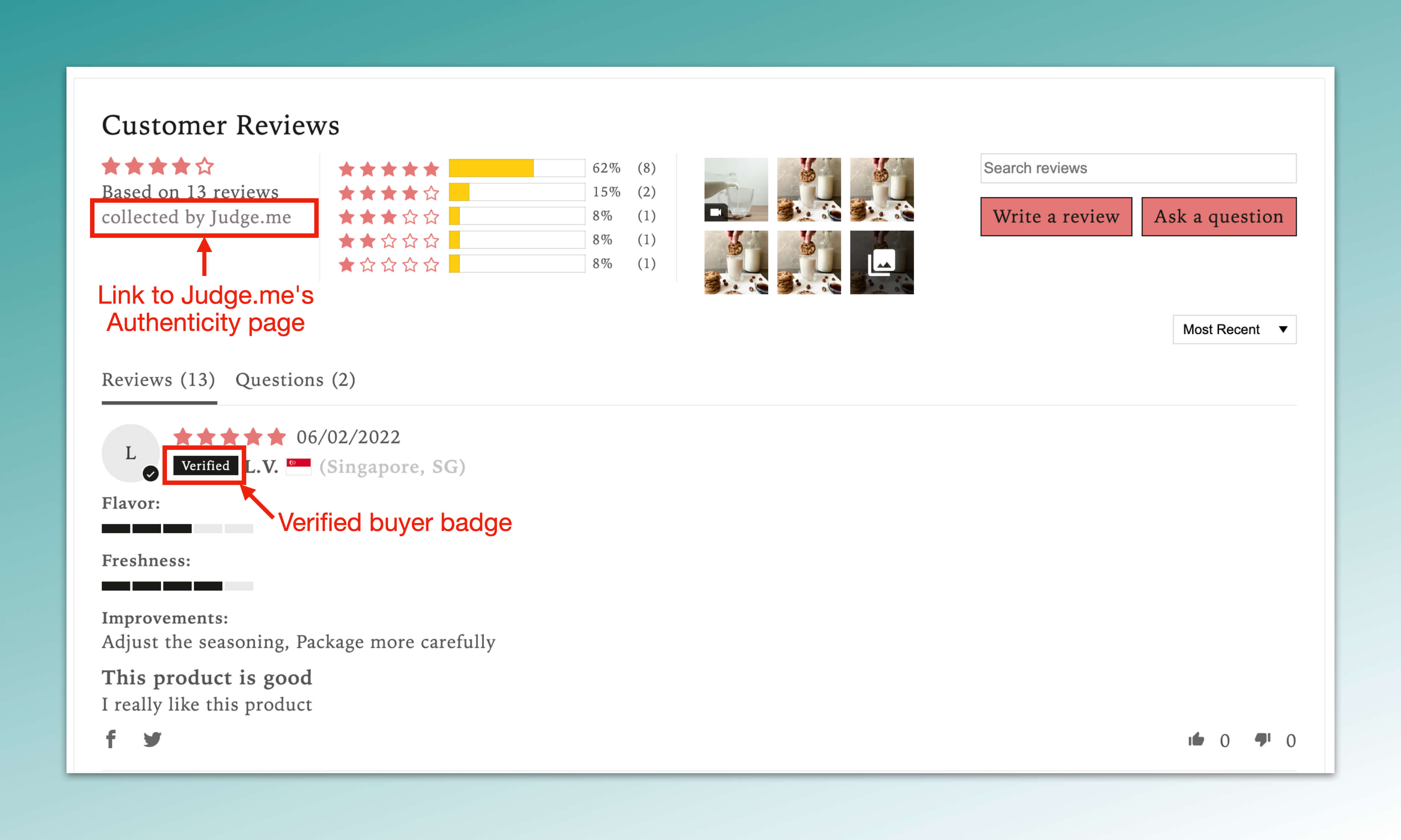 Letting consumers know how reviews are collected and managed is essential to help you comply with the EU Consumer Protection Act. This also explains how Judge.me verified buyer badge works to indicate review quality.