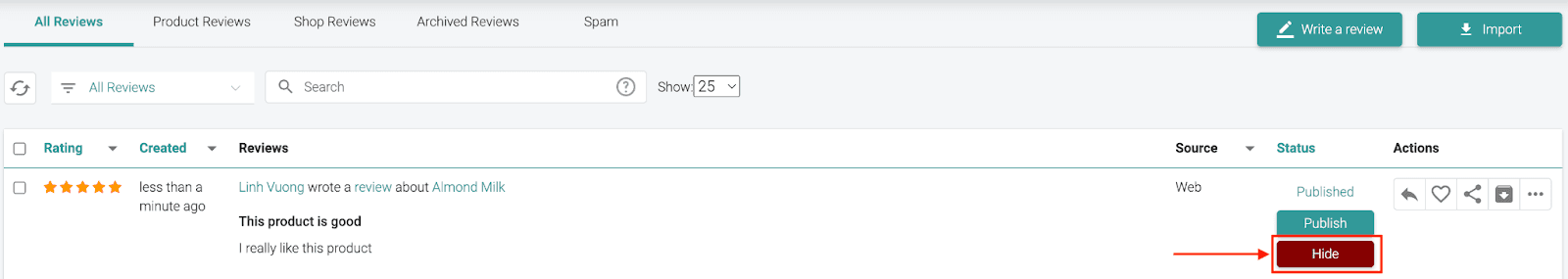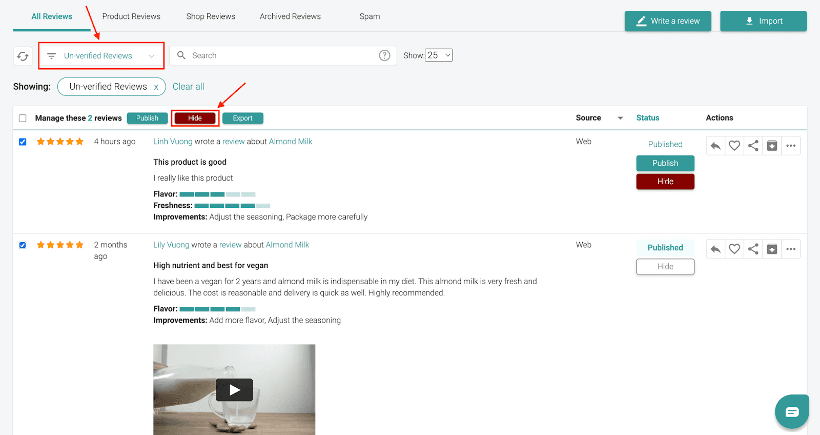 Being compliant with the EU Consumer Protection Act means you should only show verified reviews associated with your order history. To do this, you can hide unverified reviews on the Reviews dashboard by selecting the "Hide" button under the "Status" column. If you have many unverified reviews and want to hide them in bulk, choose the "Unverified Reviews" filter, select all, and click on the "Hide" button on top.