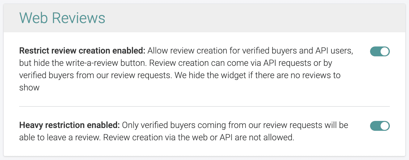 Restrict Web reviews, meaning that your "write-a-review" button is hidden, and consumers can only submit reviews from the review request emails. To do this, go to Settings > Reviews Widget > Review Curation > Web Reviews, then toggle the bar to "ON".